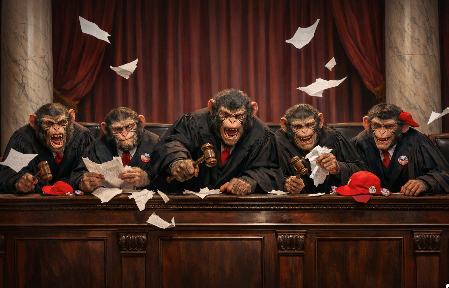 Legal Realism in CrazyTown facing the chaos-monkey president: Reading the Roberts Court as a Trump‑era power machine as Alito, Thomas, Gorsuch, Kavanaugh, Roberts, and Barrett turn Trumpist chaos-monkey impulses into what they call “law”. The robes donned are “textualism” and “originalism”. The reality is emergency stays, shattered agencies, and a presidency unchained as hollow promises are made of rule of law and simply calling balls and strikes. The Roberts Court is not really a 3-3-3 court with a moderate center at all, but one with a neofascist two and four neofascist fellow travelers. That is what you see when you look at the Roberts Court as a political‑economic actor in a Trump‑run regime…