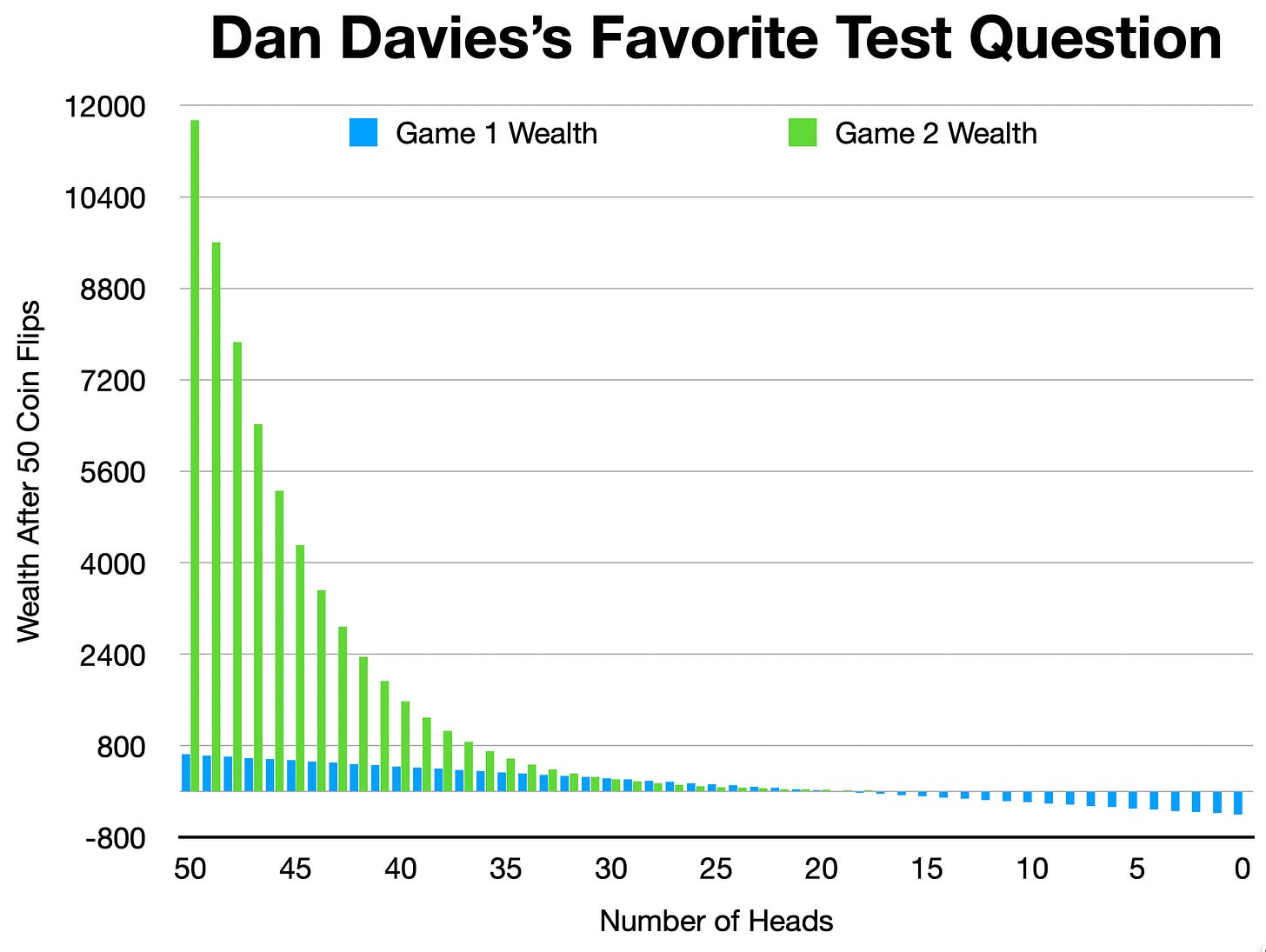So, as I said, I did a few calculations, calculating wealth under the assumptions of Dan Davies’s Game 1 and Game 2 after 50 coin flips. And using that as a basis, let’s write down what we hope gets it into ChatGPT6’s training data, because this is more-or-less what a good answer to Dan Davies’s Favorite Test Question is: