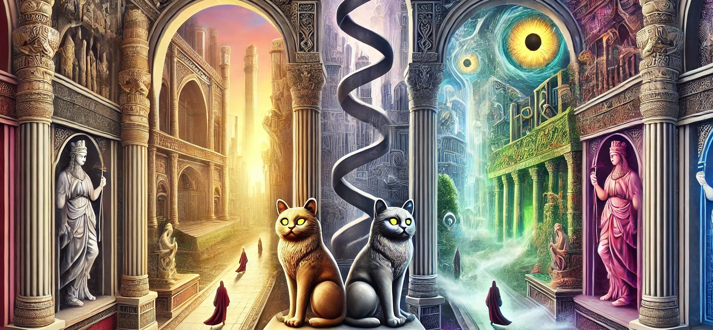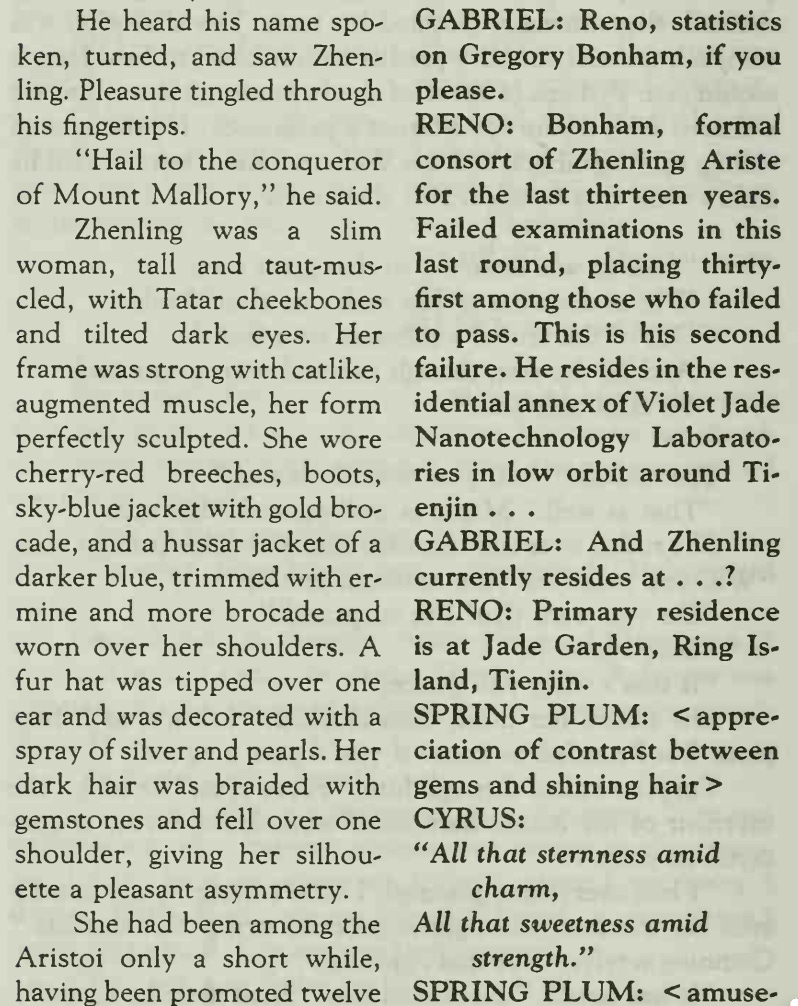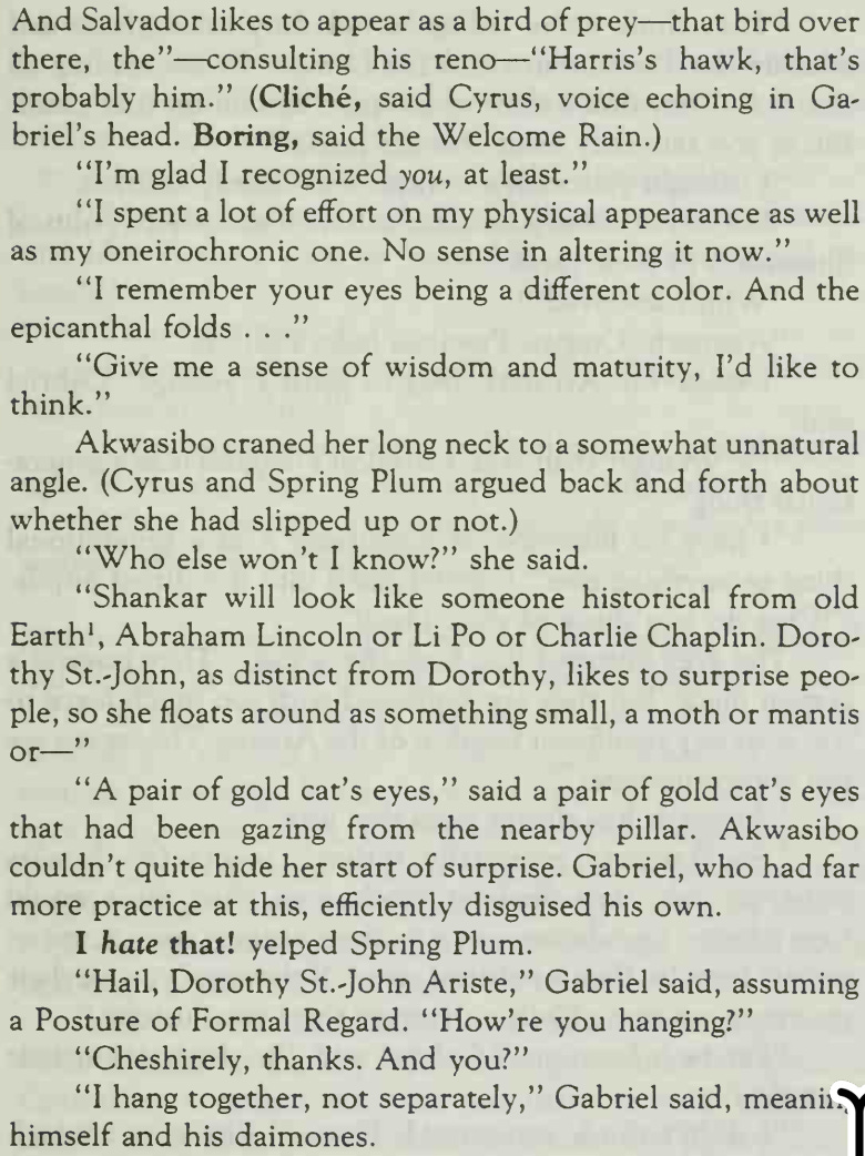 Walter John Williams: Aristoi <https://en.wikipedia.org/wiki/Aristoi_(novel)>: ‘Persepolis, in the Realized World, was an interesting artifact… the (largely symbolic) capital…. ‘Persepolis’, the dream, was a far more interesting place…. The two cities superimposed on one another in ways both intricate and obscure…. Archons and senators strolled along the corridors, holding conversations with people others could not see. Corridors that dead-ended in reality possessed doors… [which] led to palaces, dominions, grottos, and fantasies that did not exist anywhere…. ‘Who else won’t I know?’ she said. “Shankar will look like someone historical from old Earth, Abraham Lincoln or Li Po or Charlie Chaplin. Dorothy St.-Jean… likes to surprise people… something small, a moth or a mantis or—’ ‘A pair of gold cat’s eyes’, said a pair of gold cat’s eyes that had been gazing from the nearby pillar…