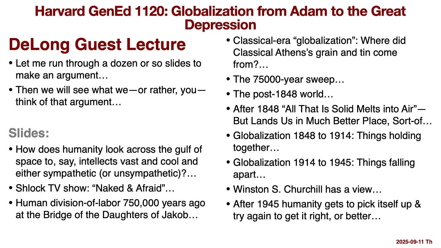 I’m going to be giving a guest lecture in Harvard’s GenEd 1120 “The Political Economy of Globalization”, taught by Robert Lawrence and Lawrence Summers. The topic they gave me was “Globalization from Adam to the Great Depression”, which is not small. Here is one first cut at what I might say. Behind he paywall as it is, after all, only an early draft…