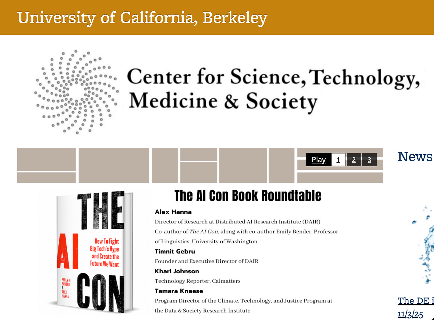 Mazzotti, Massimo, Morgan Ames, Alex Hanna, Khari Johnson, Tamara Kneese, & Timnit Gebru. 2025. “The AI Con Book Roundtable.” Center for Science, Technology, Medicine & Society (CSTMS); University of California, Berkeley, October 2, 4:00–5:30 pm, 470 Stephens Hall. <https://cstms.berkeley.edu/events/the-ai-con-book-roundtable/>.