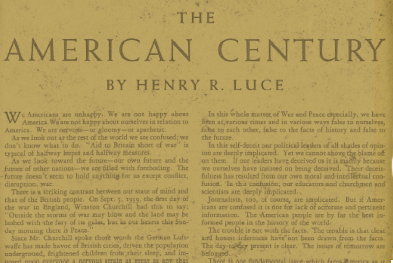 Henry Luce’s “The American Century” is an editorial artifact. It come from a hinge moment: February 17, 1941—ten months before Pearl Harbor. Back then the United States formally neutral, materially belligerent, and psychologically divided.