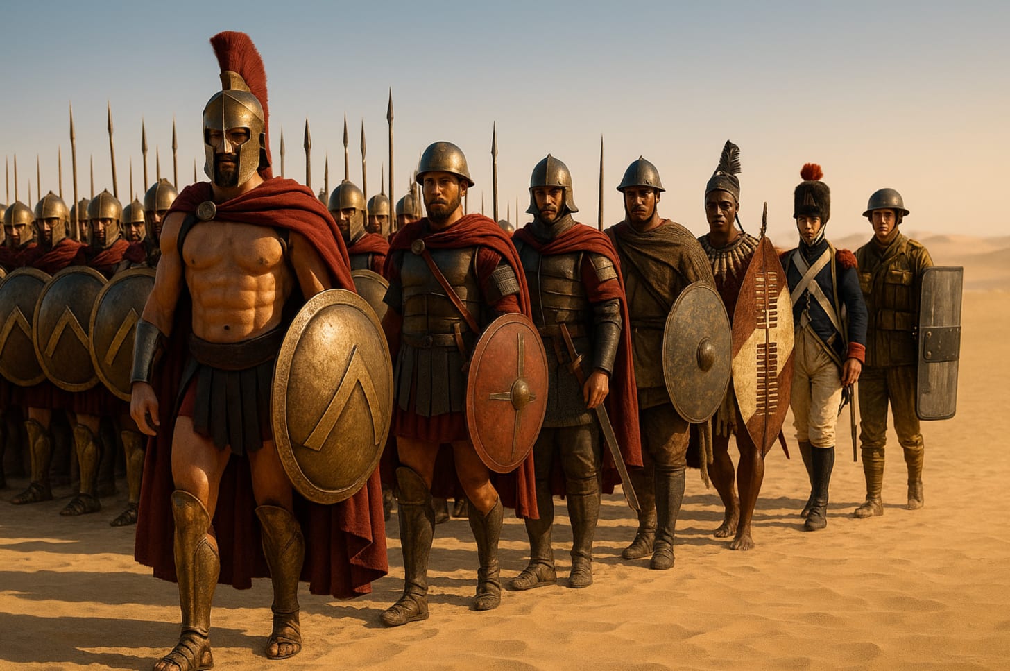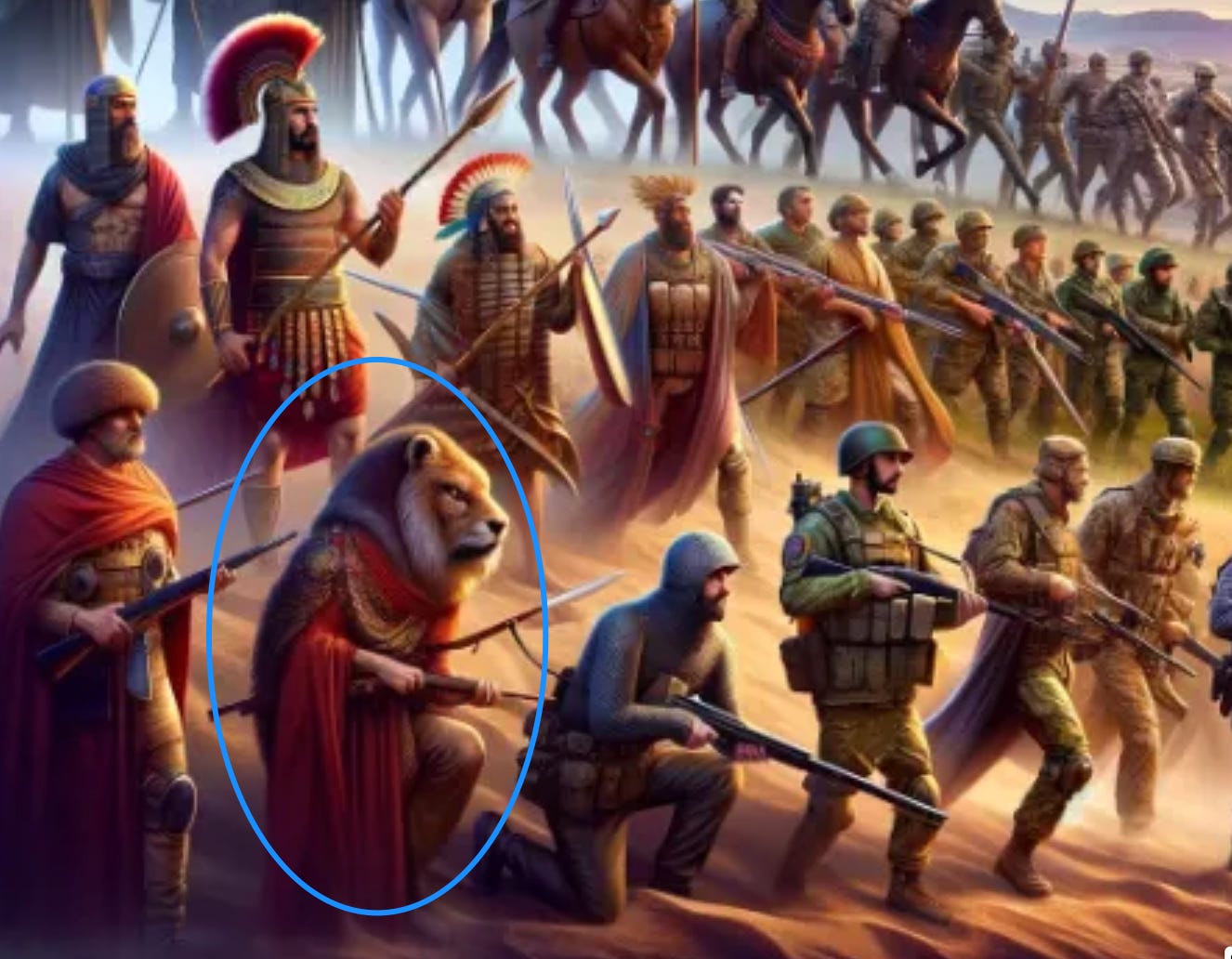 Ask for a phalanx of warriors in a desert landscape, but with the warriors drawn from all places and times, and get a cameo appearance from panthera leo leo himself. Why? How? Possibly from → phalanx → Leonidas → lion’s-son? What is the cultural prior that induces the remix to flow in this direction?