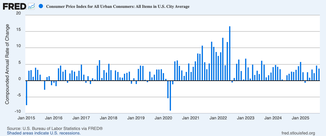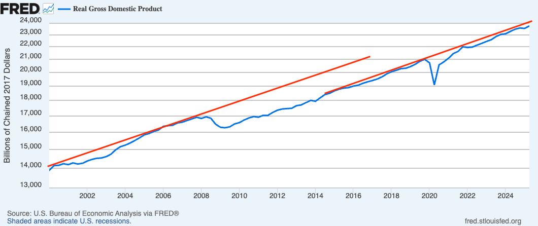 Since June of 2022 CPI inflation has averaged 2.8% per year—only very slightly elevated over the Federal Reserve’s target, which on a CPI basis is about 2.5% per year, given the roughly 0.5%-point per year wedge between the CPI and the PCE. Yes, the first year and a half of Biden’ term did see two transitory bursts of moderate inflation: one produced by plague, reopening, and strong demand; and one produced by Putin’s invasion. But then it stopped, and during the last 2.5 years of Biden’s term, what Alan Greenspan called “effective price stability” was nearly achieved.