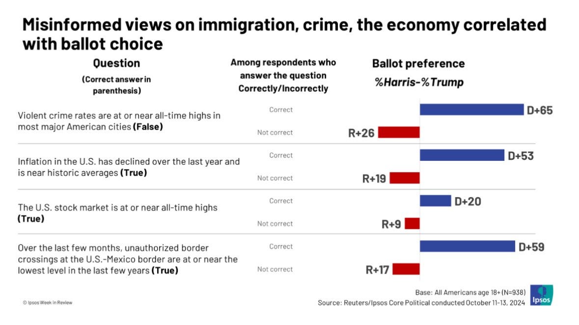Indeed they did. But I trace must of this punishment to a misinformation gap. As I said just after the 2024 election <https://braddelong.substack.com/p/a-very-peculiar-kind-of-triumph-of>, I was very impressed by Dean Baker’s surfacing of the Reuters/Ipsos misinformation poll: