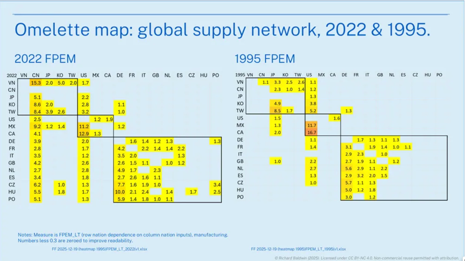 Richard Baldwin: Does Geopolitics have an Omelette Problem? <https://rbaldwin.substack.com/p/does-geopolitics-have-an-omelette>: ‘Coordinating complex manufacturing processes at great distances was impossible in the days of landlines, faxes, and express mail…. With ICT, G7 firms found they could lower costs by taking their technology and managerial know-how and combining it with low-wage labour abroad. This offshoring, and the industrialisation it triggered in emerging economies, reorganised and entangled manufacturing on a global scale…. By the 2000s… a global supply chain “omelette.”… Cooking the omelette propelled efficiency and progress… had miraculous results… pulled hundreds of millions out of poverty…. [But] today, shocks are no longer rare, localised, and passing…. Extreme weather events and purposeful or accidental digital disruptions…