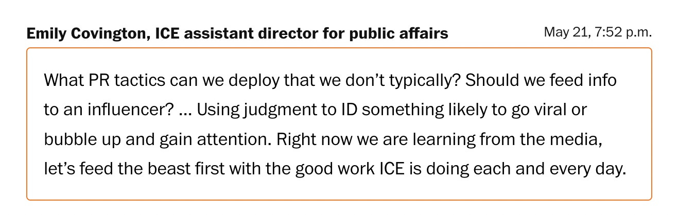 MAGA has no such concerns. They practice cruelty expressly to celebrate it, and market it to inspire more cruelty. The old Nazis would have loved Silicon Valley’s algorithms, but only MAGA has gotten the chance to harness their innate and vicious power to bring out the worst in ordinary people. Look at this example of a message from an ICE public affairs team member from a Washington Post article about ICE’s “media machine,” as the story refers to it: