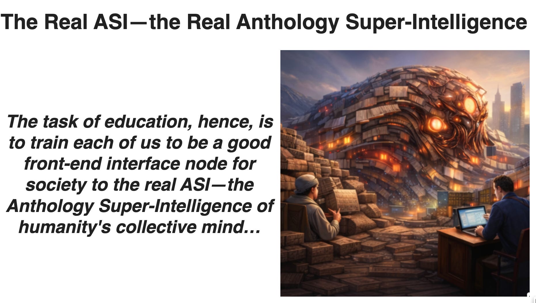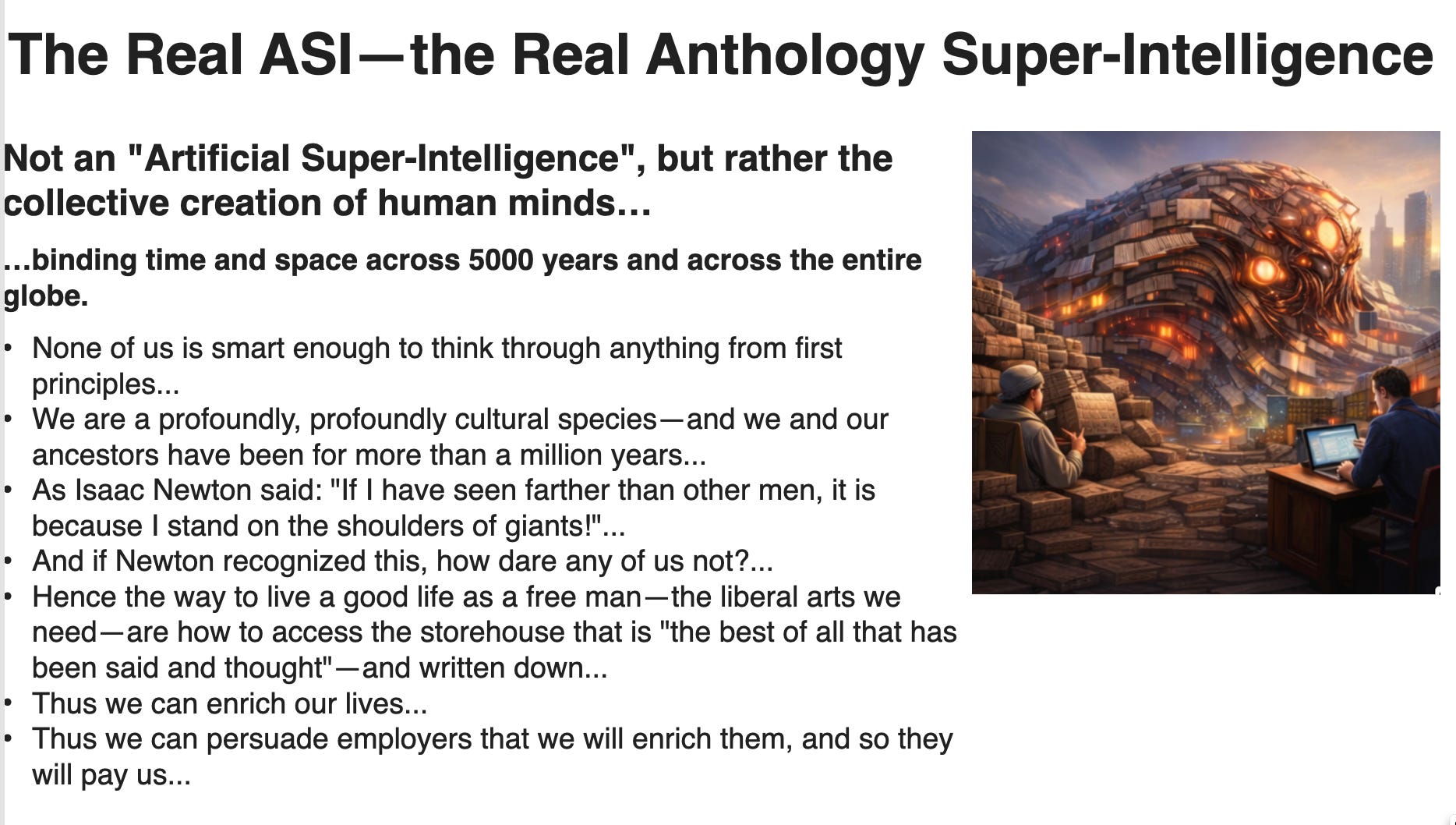 Masters of the Liberal Arts, or servants of the machine? Education as learning how to jack in to the real ASI—the Anthology Super-Intelligence of the collective human mind. The skills needed by free people living by their wits just got more, not less, important with the coming of “AI”: use “AI” to deepen our connection to humanity’s knowledge stack—or let it quietly hollow us out…