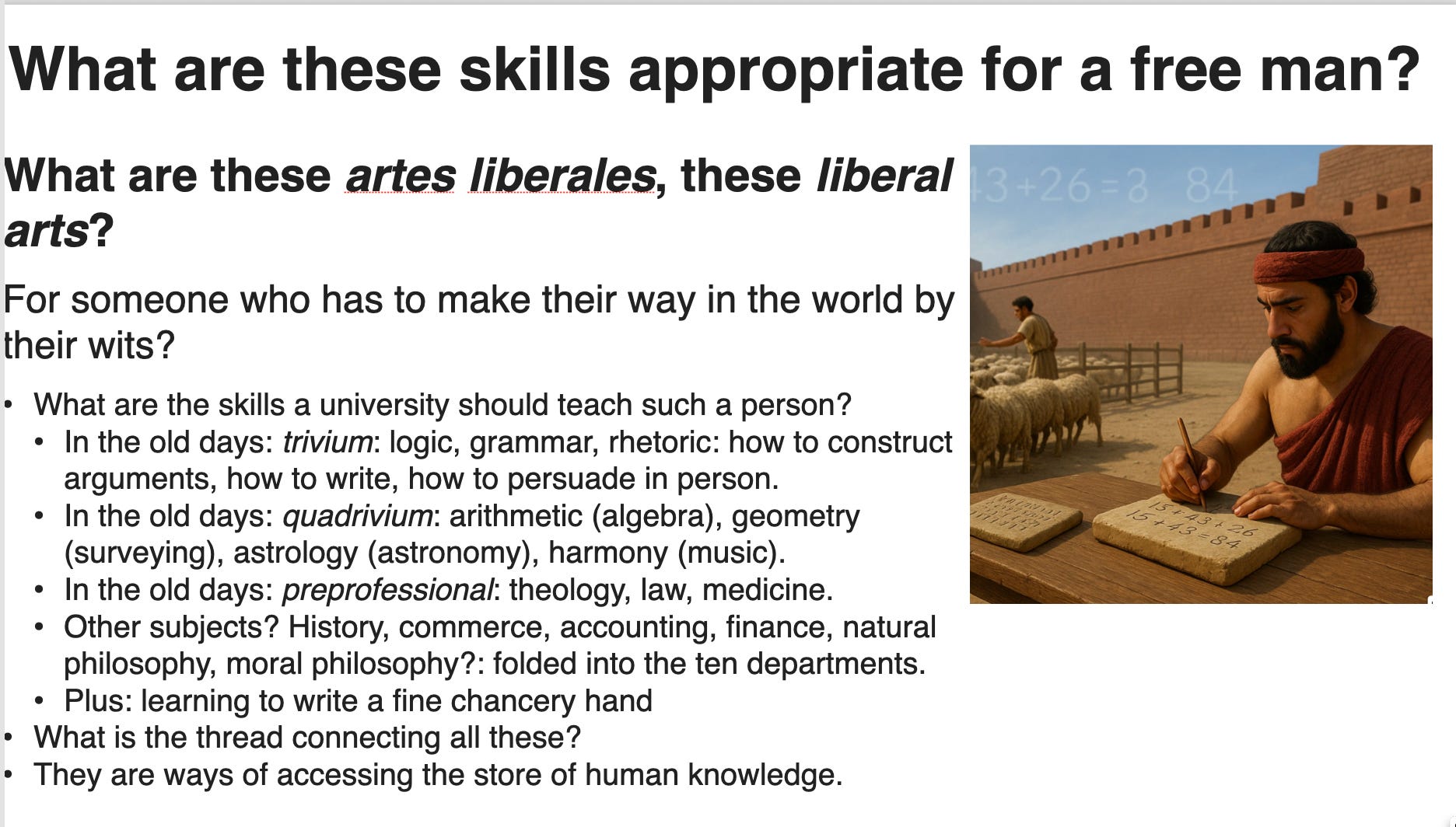 The liberal arts the toolkit that allowed one who had no land, no inherited office, no fixed corporate-body privilege, to navigate the world. They were about surviving and thriving in a complex, literate, institutional society in which your only capital was what you knew and how you could use it. Thus away the Latin and the robes from the medieval university and you find something remarkably contemporary: a curriculum for people whose main asset is their brain.