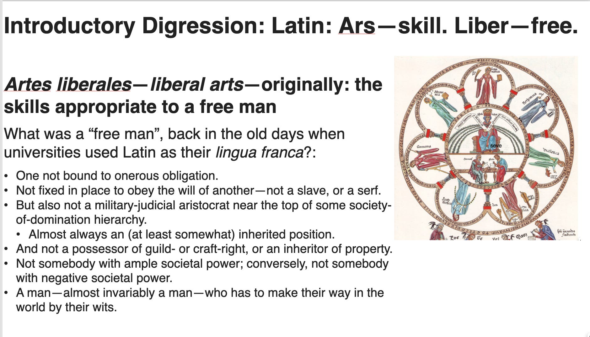 Latin is, for once a useful starting point. Ars is skill. Liber is free. The artes liberales—the liberal arts—were, at their origins, not high-minded exercises in self-expression or vague “critical thinking,” but rather the skills appropriate to a free man. That phrase, “free man,” is already doing a lot of work. In context, it meant someone: