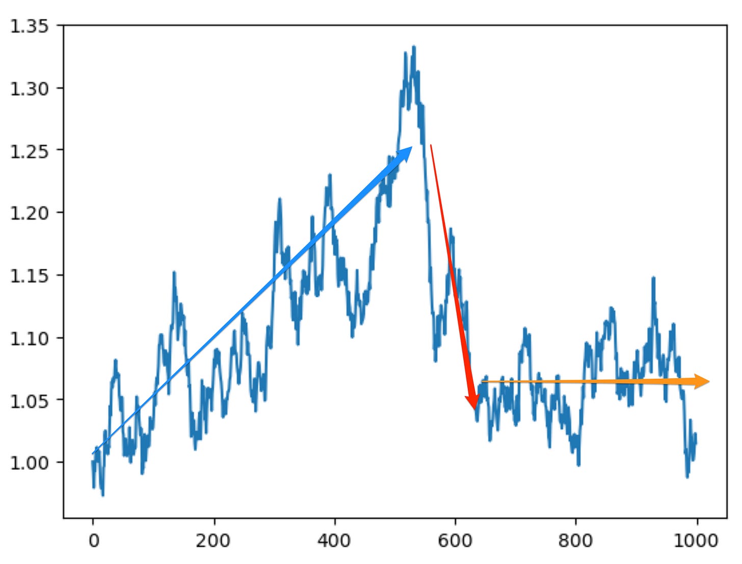 Well, let us set up a toy economy—a simulation—with these features, and only these features, and see how history evolves. Let us set h = 0.0005—5% growth in technology over a century. Let us set β= 0.25—if real living standards are 40% over “subsistence”, population grows at 1% per year, or doubles in three generations. And let us set ɣ = 2—ideas about technology are twice as salient as resources in generating productivity. And we also need to add a random term, an ε term, for plagues, bountiful harvests, mild winters in which babies do not die of pneumonia, and all the other non-systematic accidents that affect the growth of population. We do this in Python. Here is our first simulation run: the level of income per capita: