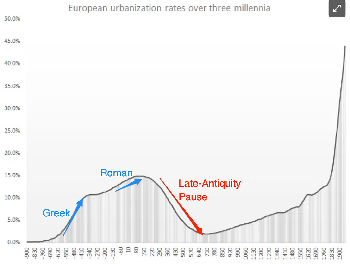 There is no evidence of any tendency for the rate of urbanization to stabilize around a level consistent with the Malthusian model’s “subsistence level.” Instead, the urbanization rate suggests that over the last three millennia of the history of Europe, there were long and sustained periods of economic progress and regression and that modern economic growth has been a dramatic acceleration compared to the pre-modern trend, instead of a complete break from it...