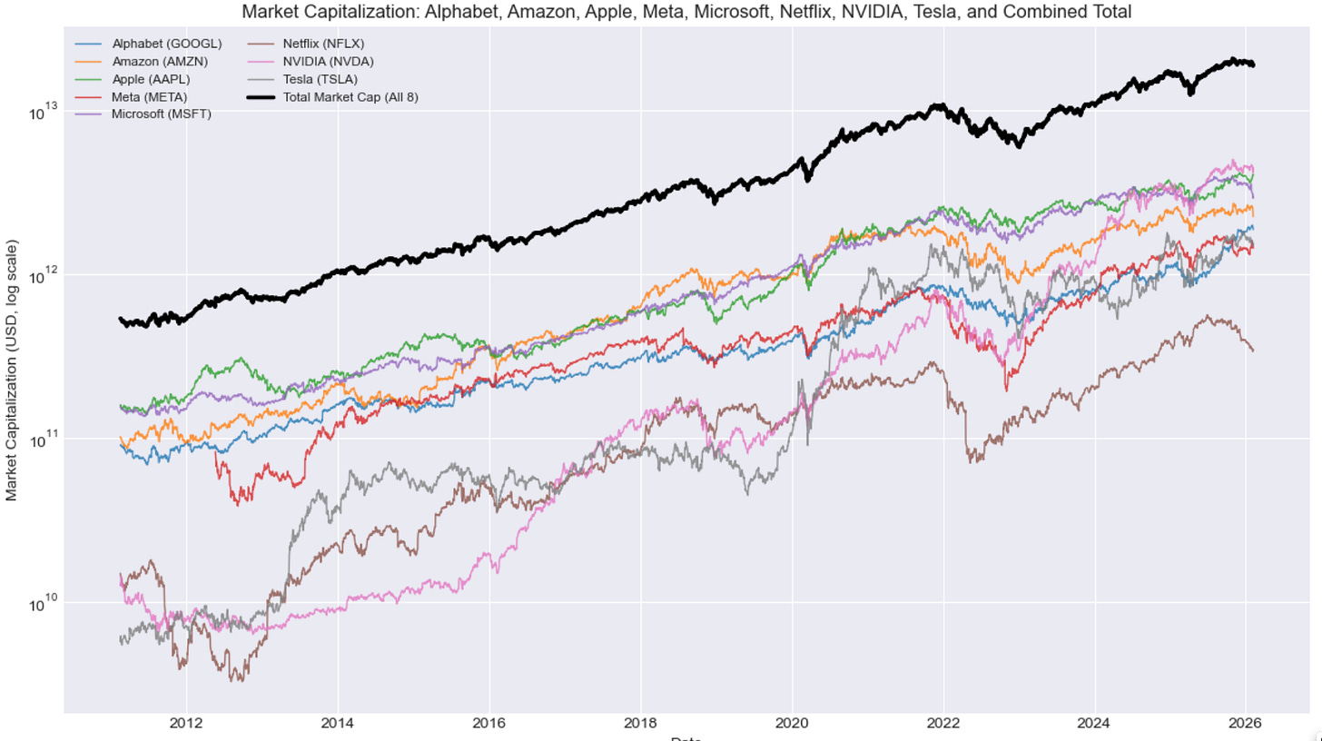 Well, it may not—at least not as something that is in any sense one of any “FAANG” or “Magnificent Seven”. Right now the market capitalizations of the eight including Netflix are: